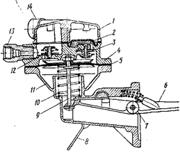 Механизм регулирования количества подаваемого топлива (рис. 5) предназначен для увеличения или уменьшения количества топлива, пода-ваемого в цилиндры, при изменении режима работы дизеля. Механизм состоит из рейки 12 , на которой стяжными болтами 10 закреплены хому-тики 9 и скобы 1 . В пазы хомутиков входят поводки 8 плунжеров. Рейка 12 с помощью скобы 1 связана с регулятором частоты вращения.