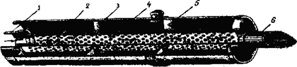 1и 6- патрубки; 2– труба; 3 и 5 – перегородки; 4 – корпус.