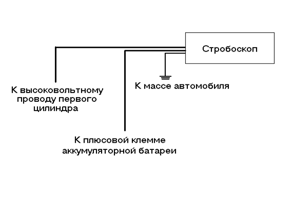 После прогрева двигателя, заглушить мотор. Вытащить высоковольтный провод первого цилиндра из гнезда крышки распределителя, и установить переходник стробоскопа в гнездо первого цилиндра крышки распределителя. На переходник надеть высоковольтный провод первого цилиндра. Подключить «массовый» провод к массе автомобиля, а плюсовой провод к плюсовой клемме аккумуляторной батарее. После чего можно запускать двигатель.