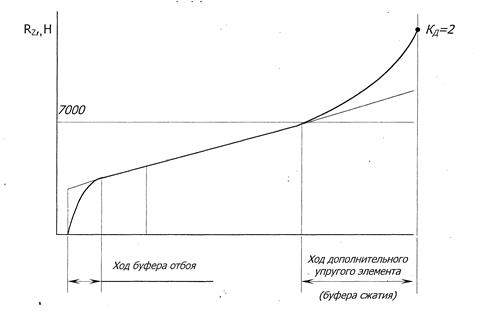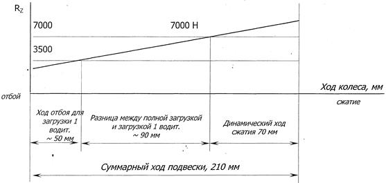 Упругая характеристика, построенная таким образом, не обеспечивает должного коэффициента динамичности подвески. Обычным является значение Кд =2 для вертикальных нагрузок. Кроме того, при полном ходе отбоя на колесе имеется сила 1400 Н (140 кгс). Без дополнительных упругих элементов подвеску будет "пробивать", также будут ощутимы толчки на "подхватах". Чтобы их не было, вводим дополнительные упругие элементы.