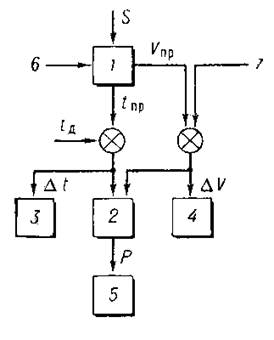 Автомашинист действует по программе (см. рис.), отражающей заданный график движения и содержащей граничные условия движения (допустимые скорости V , интенсивности разгона и замедления и т. п.). При движении поезда по пути S автомашинист сравнивает действительное время t с программным t и, с учётом граничных условий, с помощью блока 2 меняет режимы Р ведения поезда, выбирая момент или точку пути для перехода от одного режима к другому.