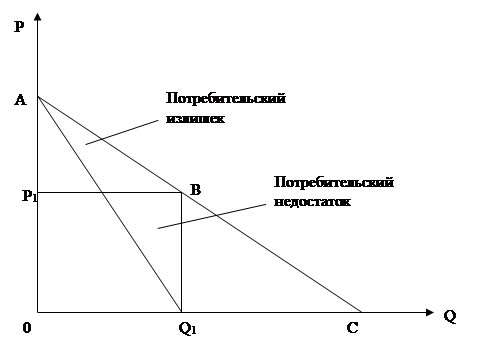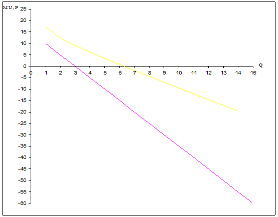 Это значит, что линия нулевого потребительского излишка является одновременно и линией средней полезности, она фиксирует максимально допустимый для данного индивида уровень рыночной цены при соответствующем объеме спроса. Если рыночная цена превысит этот рубеж, то индивидуум получит уже не нулевой, а отрицательный потребительский излишек.