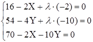 Z = 16X + 54Y − X2 − 2Y2 + l(70 − 2X − 10Y)