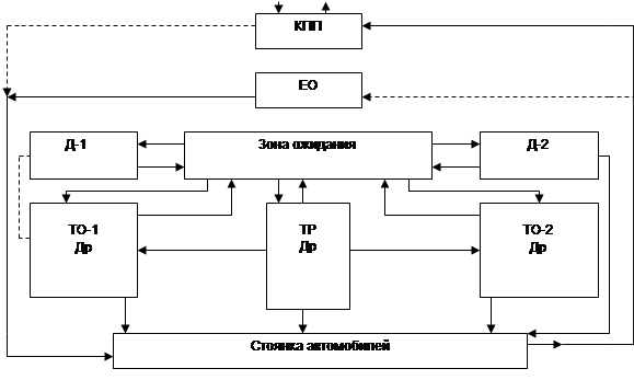 На Рисунке 2 сплошными линиями показан основной путь следования автомобилей через соответствующие производственные участки с момента их прибытия до выпуска на линию. По скольку прибытие автомобилей происходит в течении относительно короткого времени, а пропускная способность зоны ЕО расчитана на одну или две рабочие смены, то большая часть автомобилей после приема направляется в зону хранения, откуда в порядке очереди они поступают в зону ЕО и далее в соответствии с графиком на посты обслуживания или в зону хранения.