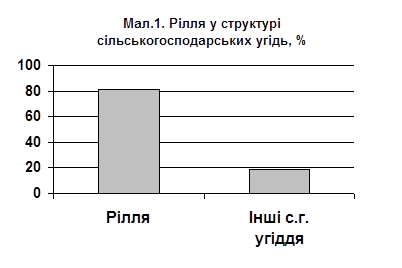 Характерною особливістю структури сільськогосподар- ських угідь є висока питома вага орних земель (більше 80%). Інші площі використовуються під багаторічні насадження (2,7%), сінокоси (5,1%) і пасовища (11,4%) (мал.1)