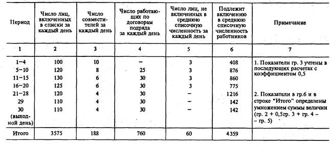 Обобщим все сказанное выше с помощью примера, содержащего данные по фирме за апрель, в котором для экономии места предполагается, что в отдельные периоды времени, которые выделены в графе 1, численность работников, подлежащих учету в списочном составе, не изменяется (табл.2).