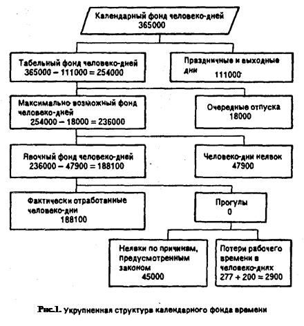 Далеко не весь объем календарного фонда времени работников может быть реально использован в производственной деятельности фирмы. В составе календарного фонда времени каждого работника за достаточно длительный период обязательно будут выходные и праздничные дни; дни очередного и дополнительных отпусков, предусмотренные трудовым законодательством; дни неявок на работу по болезни и другим причинам, предусмотренных законом (участие в работе выборных общественных и других организаций, выполнение мужчинами обязанностей, вытекающих из закона о воинской службе); неявки на работу с разрешения администрации и, наконец, прогулы.