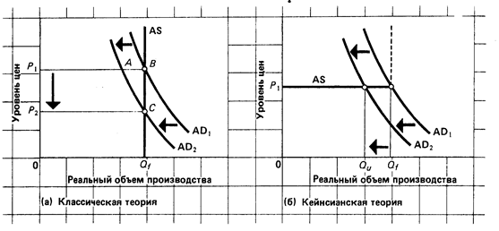 Последнее замечание. Если уменьшение предложения денег и соответственно совокупного спрос: и произойдет, то экономика, как показано на рисунке 5-1a, не будет подвержена безработице. Конечно, вследствие падения совокупного спроса с AD1 до AD2 незамедлительно появится избыток предложения продукции в том смысле, что совокупный объем товаров и услуг превысит совокупные расходы на величину АВ . Но если принять во внимание предположение об эластичности цен на продукцию и ресурсы в сторону понижения, этот избыток предложения продукции вызовет падение цен на продукцию вместе с понижением заработной платы рабочих и цен на другие вводимые ресурсы. В результате этого уровень цен будет быстро понижаться с Р1 до Р2 , пока не наступит равновесие между предложением продукции и спросом на нее, на этот раз в точке С . Поскольку уровень цен понизился с Р1 до Р2 , реальный объем производства останется на уровне, соответствующем полной занятости.