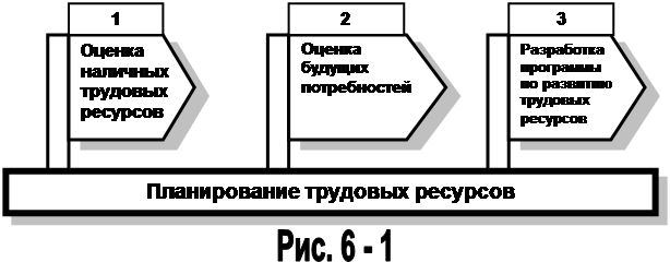 Планирование людских ресурсов по существу представляет собой применение процедур планирования для комплектации штатов и персонала. Для удобства можно считать, что процесс планирования включает в себя три этапа (рис. 6-1):