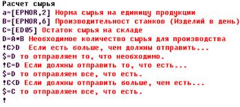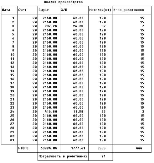 Итак, мы видим, как проводилось планирование и в результате ясно, что для работы производства на полную мощность в январе 1999 г. необходим 21 работник. Заработная плата каждого составляет 84 грн. Чистая прибыль составила 1873 грн. Кроме того, в данном примере введено упрощение – нет расчета заработной платы руководителей, техников и других работников по статусу выше рабочих. Но в целом данная модель вполне работоспособная и если ее усложнить (Ввести несколько видов сырья, изделий; Использовать несколько поставщиков и покупателей), то на ней возможно проведение планирования на реальном предприятии, как на производстве, так и в торговле.
