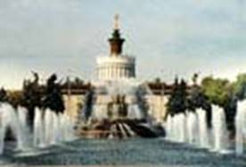 Из центрального павильона мы выйдем на площадь Дружбы народов , которую украшает фонтан «Дружба народов» , сооруженный по проекту Г.Д. Константиновского и К.Т. Топуридзе. Позолоченные бронзовые фигуры девушек с дарами земли в руках символизируют дружную семью советских республик. Каждую секунду фонтан выбрасывает в воздух более тонны воды на высоту восьмиэтажного дома. Своеобразная экспозиция по истории советской архитектуры – ансамбль площади Дружбы народов. Его составляют павильоны, построенные в разное время, отразившие как различные направления советской архитектуры, так и национальные стили.
