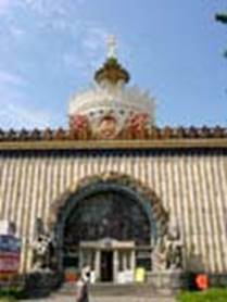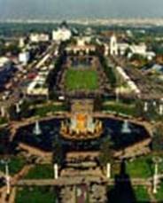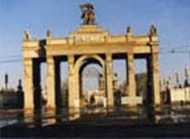 Мы стоим перед Главным входом. Пропилеи монументального Главного входа достигают 25 метров высоты. Аллея, по сторонам которой установлено 14 фонтанов в виде чаш из красного гранита, подводит к центральному павильону. (посмотрите прямо) Он построен в лучших традициях русской архитектуры. Три его яруса, украшенные колоннадами, завершаются шпилем с золотой звездой диаметром 3,5 метра. Высота павильона со шпилем – 90 метров. Его экспозиция отражает важнейшие вехи социалистического строительства. Далее мы проходим к площади Дружбы Народов, на которой установлен фонтан Дружбы Народов. Этот фонтан был сооружён по проекту Г.Д. Константиновского и К.Т. Топуридзе. Позолоченные бронзовые фигуры девушек с дарами земли в руках символизируют дружную семью советских республик. Каждую секунду фонтан выбрасывает в воздух более тонны воды на высоту восьмиэтажного дома. Своеобразная экспозиция по истории советской архитектуры – ансамбль площади Дружбы народов. Его составляют павильоны, построенные в разное время, отразившие как различные направления советской архитектуры, так и национальные стили.