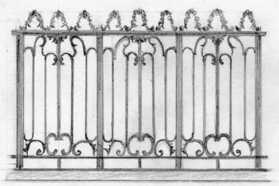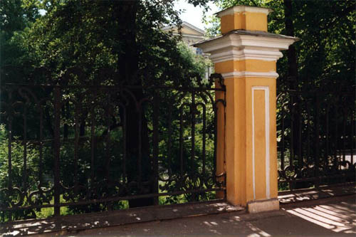 Парадный двор отделен от улицы прекрасной ажурной оградой, выполненной по рисунку Растрелли. Это один из ранних примеров русского художественного чугунного литья. В орнаменте решетки гармонично сочетаются геометрические и растительные мотивы. Особенно хорош узор главных въездных ворот. Он виртуозен, отличается тонкостью, изысканностью. Легкий ажур ограды прерывается мощными столбами.
