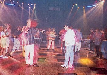 На сцене по кругу расставляются стулья. На них садятся играющие - мужчины и женщины. Выбирается водящий. Ему завязывают глаза. Включается музыка, и водящий идет по кругу. Как только музыка прерывается, водящий останавливается и садится на колени к тому, возле кого он остановился. Тот, к кому он сел, должен затаить дыхание и не выдать себя. Остальные спрашивают: «У кого?» Если водящий угадает, у кого он сидит на коленях, то тот становится водящим. |