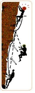 Первый в связке начинает двигаться вверх. При этом он организует точки страховки. Как часто их надо делать? Здесь нужно иметь представление о факторе рывка и о том, на какой веревке ты работаешь. Если веревка удовлетворяет требованиям UIAA, это уже хорошо, но это не все. Веревки могут иметь различные значения рывка по тесту UIAA. Чем это значение меньше, тем веревка мягче и рывок будет меньше. Такая веревка предпочтительнее (естественно она будет и дороже). Далее, точки надо делать чаще вначале и допускается делать реже в конце. Например, чтобы фактор рывка был бы не более К=0.5 (в этом случае рывок на веревку будет не более 340 кг при жестком закреплении веревки, которая по тесту UIAA показывает рывок 1200 кг) точки надо располагать на следующих расстояниях от базы: 3, 6, 8, 11, 15, 20, 26, 34, 45 метров.