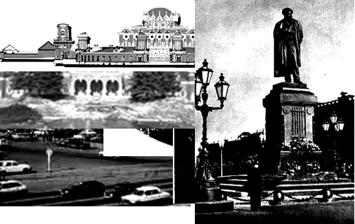Эта площадь довольно старинная. Раньше на ней стояли тримфуальные ворота. Раньше это место было въездом в Москву, и император Александр I, после войны 1812 года и взятия Парижа, приказал воздвигнуть арку. Архитектором был Бове. В 1968 году эта арка восстановлена и установлена на площади Победы.Позади остается Тверская-Ямская. Перед нами встает здание гостиницы «Пекин» – одна из самых дорогих гостиниц в Москве. И, конечно, не остается незамеченым памятник Маяковскому. Когда-то сам поэт говорил: «Я буду стоять рядом с Пушкиным!». И оказался практически прав. Следущую площадь, которую мы посетим, будет Пушкинская и она находится рядом. Проходя музей Революции, мы заметим «львов на воротах».В 1829 году в заново отстроенном после пожара 1812 года доме Разумовского жил персидский принц Хозров-Мирза, а затем дом был сдан Английскому клубу, который и помещался здесь до самой революции, а теперь в его залах развернулся историка-революционный музей. Дом этот, вернее, его двойные ворота со львами, быть может, воспеты Пушкиным в седьмой главе «Онегина» в картине Тверской из окна несущегося через ухабы возка с Татьяной. Одни из этих ворот не устояли пред натиском российского капитализма довоенной эпохи: против дома Разумовского выросло на Тверской безобразное здание магазинов - Английские ряды, как называли их в насмешку, а пара львов была взята с ворот для украшения фасада соседнего здания театра «Кино Арс». Революция уничтожила «ряды» и открыла вид на мощную пестумскую колоннаду разумовского дома, но пушкинские львы все еще в плену у кинематографа.