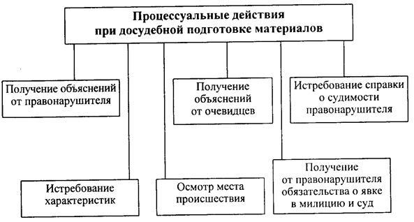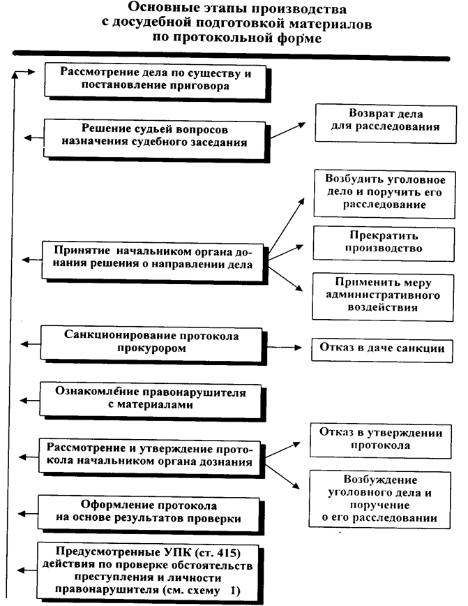 Досудебный этап подготовки материалов указанной форме осуществляется органами дознания; чаще всего это органы милиции. В соответствии со ст. 415 УПК по делам о преступлениях, перечисленных в ст. 414 УПК, эти органы не позже чем в десятидневный срок после получения информации о совершенном правонарушении, устанавливают его обстоятельства, данные о личности виновного, получают от него объяснения, опрашивают очевидцев содеянного, истребуют справку о наличии или отсутствии судимости у правонарушителя, характеристику с места его работы, учебы и места жительства и другие материалы, имеющие значение для рассмотрения дела в суде (см. схему 1).