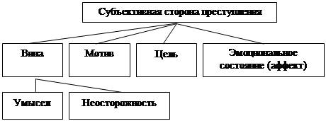 Преступление, как общественно опасное деяние, совершается при взаимной обусловленности объективных и субъективных признаков. К числу первых относится объект и объективная сторона. К числу вторых – субъект и субъективная сторона. Общим для названных признаков является то, что они с разных сторон характеризуют одно и тоже социальное явление – преступление.[1] Однако в теории науки нам представляется возможным вычленить отдельные признаки из их совокупности. В отличие от объективной стороны, субъективная сторона преступления является его внутренней (по отношению к объективной стороне) характеристикой. Наиболее просто её можно обозначить как психическое отношение преступника к совершённому им преступлению. Развивая мысль, можно сказать, что субъективная сторона преступления характеризует отношение сознания и воли субъекта к совершённому им общественно опасному деянию и его последствиям. Содержание субъективной стороны преступления составляют: вина, мотив и цель преступления, а также эмоциональное состояние лица в момент совершения преступления. Все эти признаки характеризуют процессы, происходящие в психике лица, совершившего преступление. Схематически содержание субъективной стороны преступления можно выразить следующим способом.