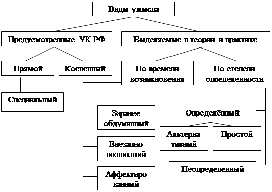 В УК РФ[11] дается общее понятие умышленной формы вины и содержится определение двух видов умысла: прямого и косвенного.