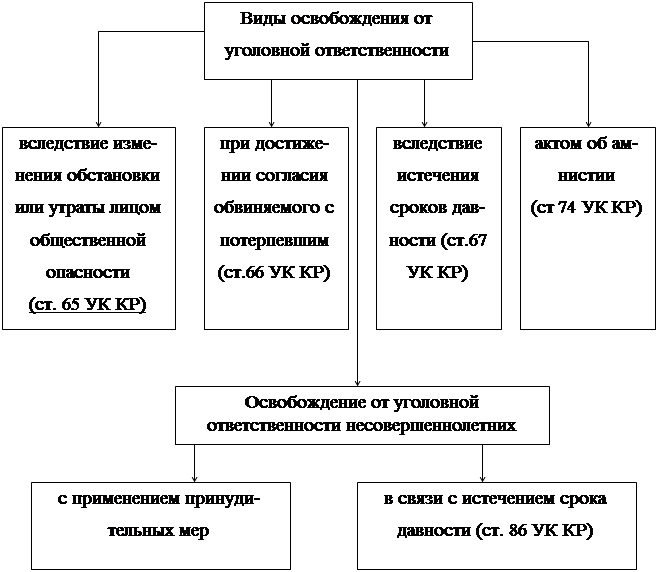 Освобождение от уголовной ответственности правовой институт, в котором находят закрепление также специфические для периода становления демократии и гласности в Кыргьгзской Республике закономерности, как частичная передача обществу отдельных функций государственных органов, значительное сужение сферы уголовной репрессии и расширение сферы убеждения, правильное сочетание в борьбе с менее тяжкими преступлениями мер государственного принуждения с мерами общественного воздействия.