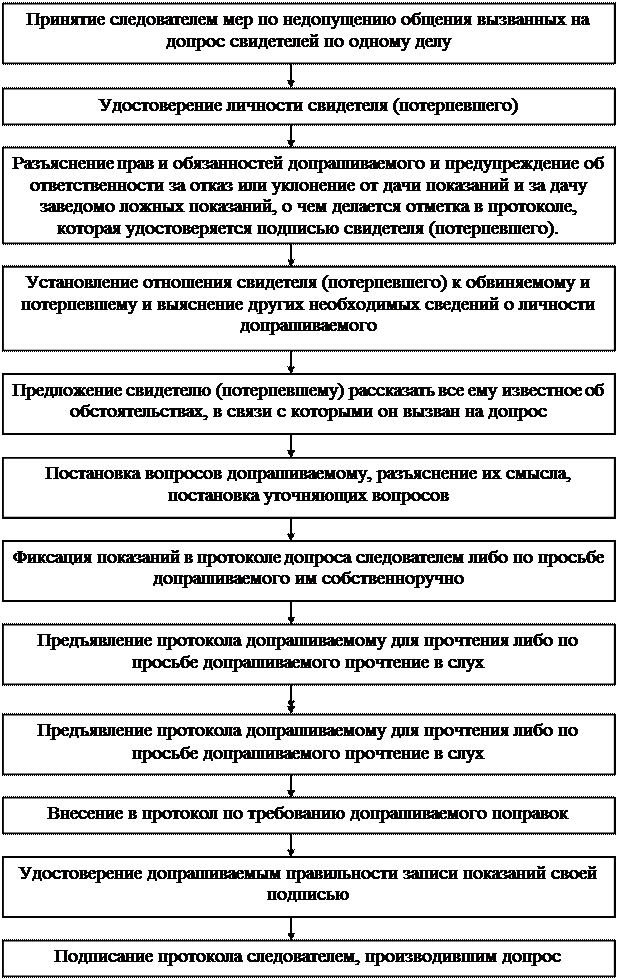 5. Порядок допроса. В УПК регламентирован порядок производства допроса. Здесь сказано следующее. Свидетели (потерпевшие), вызванные по одному и тому же делу, допрашиваются по раздельности и в отсутствие других свидетелей (потерпевших). При этом следователь принимает меры к тому, чтобы свидетели (потерпевшие) по одному и тому же делу не могли общаться между собой.