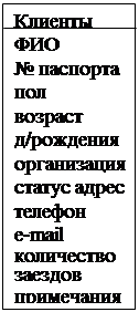 Таблица «Клиенты» представляет собой набор информации, аналогичный карточке гостя и служащий для более полной работы с ним службы маркетинга (если таковая имеется). Поле «№ Паспорта», будучи изначально уникальным, введено для удобства работы с базой данных и исключения путаницы (ведь имена могут повторяться). Поле «возраст» не вводится пользователем, а рассчитывается как разница системной даты и даты рождения гостя. Поле «количество заездов» служит для отображения частоты посещения гостем гостиницы. Его значение увеличивается на единицу каждый раз, когда оформляется очередной заезд, и не редактируется. На основе количества заездов может определяться статус гостя (например, «обычный гость», «постоянный клиент», «привилегированный клиент» и т.п.) и ставка скидки. Постоянные контакты, хранение как можно более полной информации о гостях способствует доброжелательным с ними отношениям и определенно склоняет их к последующему выбору именно вашей гостиницы. Так, один из наиболее эффективных инструментов упоминания о себе – поздравления с днем рождения и другими праздниками по электронной почте – многими АСУ осуществляется автоматически без всякого участия оператора АСУ.