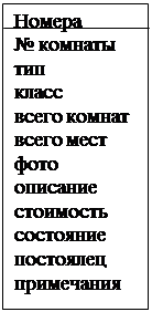 Таблица «номерной фонд» по большей части предназначена для гостей и содержит необходимую для них информацию. Здесь пояснения может потребовать поле «состояние». Это по сути отметка о занятости номера. Ему лучше присваивать одно из четырех значений: свободен, занят, забронирован и снят с продажи. От значения «забронирован» можно было бы и отказаться, поскольку его текущее состояние – «свободен», однако такое представление номеров можно использовать для обособления части номерного фонда, предназначенной для свободной продажи, а не для бронирования.