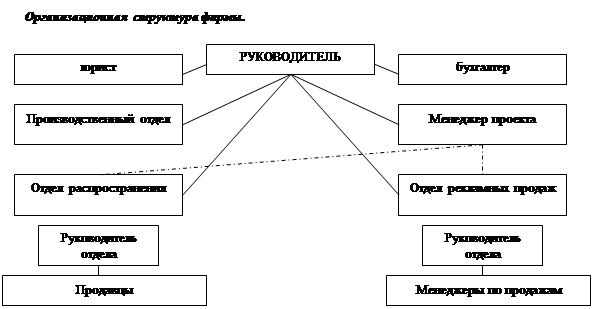 | Руководитель организации | 1. Разработка и контроль реализации стратегии фирмы; 2. Установление целей отделам распространения и рекламных продаж, контроль их выполнения; 3. Представление фирмы в деловых кругах города. |