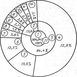 Круговым графиком выражают соотношение составляющих какого-то целого параметра и всего параметра в целом, например: соотношение сумм выручки от продажи отдельно по видам деталей и полную сумму выручки; соотношение типов используемых стальных пластин и общее число пластин; соотношение тем работы кружков качества (отличающихся содержанием) и общее число тем; соотношение элементов, составляющих себестоимость изделия, и целое число, выражающее себестоимость, и т. д. Целое принимается за 100% и выражается полным кругом. Составляющие выражаются в виде секторов круга и располагаются по кругу в направлении движения часовой стрелки, начиная с элемента, имеющего наибольший процент вклада, в целое, в порядке уменьшения процента вклада. Последним ставится элемент «прочие». На круговом графике легко видеть сразу все составляющие и их соотношение. Пример кругового графика показан на рис. 2.3, где представлено соотношение составляющих себестоимости производства.