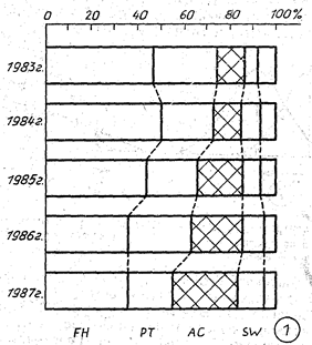 При взгляде на график видно, что доля выручки от. продажи изделий АС из года в год увеличивается. Что же касается изделий FH (в 1987 г. их доля составляет 36,8%) и РТ (в 1987 г. их доля составляет 20,8%), то хотя их вес в 1987 г. все еще значителен, за период с 1983 по 1987 г. их общая доля в выручке уменьшилась с 75,6.% до 57,6%. Это объясняется изменением жизненного цикла изделий. Анализ графика приводит к выводу, что в связи с изменением обстановки необходимо направить усилия на разработку новых видов изделий.