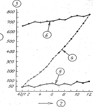 | Рис. 2.5. Контроль cyммы выруки: 1—выручка; 2— месяцы года: 3— мля. иен: 4— кумултивная сумма выручки по месяцам: 5—выручка по месяцам: 6—меняющаяся итоговая выручка |