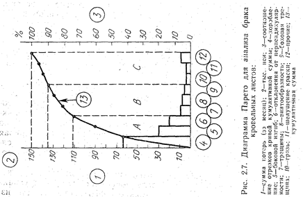 Диаграмма Парето для решения таких проблем, как появление брака, неполадки оборудования, контроль деталей на складах и т, д. строится в виде столбчатого графика, столбики которого соответствуют отдельным факторам, являющимся причинами возникновения проблемы. Столбики разделяются на группы А, В, С по числу случаев или по сумме потерь. На графике строится кривая кумулятивной суммы, по соотношению отрезков которой, относящихся к группам А, В, С, можно легко оценить фактическое положение дел (рис. 2.7).