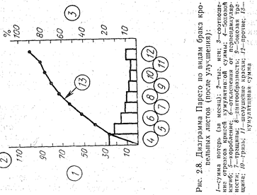 5) строят на миллиметровке столбчатый график, где каждому виду брака соответствует прямоугольник (столбик), вертикальная сторона которого соответствует значению суммы потерь от этого вида брака (основания всех прямоугольников равны), и вычерчивают кривую кумулятивной суммы (кумулятивного процента). На правой стороне графика по оси ординат откладывают значения кумулятивного процента. Полученный график называется диаграммой Парето (см. рис. 2.7);