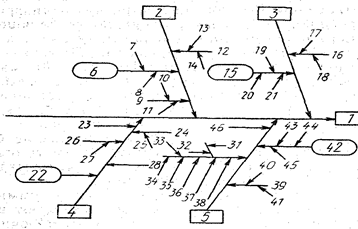 /--коробление; 2-материал; 3-формовочный станок; 4-методы операций; 5-оператов 6- .двфекты материала; 7-растяжение по краям; 8-растяжение а центре; 9-качестзсi материала; 10-прочность на растяжение; 11-твердость; 12-исходная толщина листа- /3-толщина слоя краска: 14-толщина плакировки; 15-регулировка; 16-техническое обслуживание и контроль; 17— повседневный контроль, (текущий контроль); 18—периодический контроль- 19— центрирование валков; 20—составление теста; 21— разница в высоте валкое; 22—операции формовочного станка; 23— принятие материала; 24— рабочий стол- 25—одинаковость высоты с высотой формовочного станка; 26— степень горизонтальности пола на рабочем месте- 27— степень горизонтальности станка; 28— содержание операций; 29— условия, в которых проводятся операции; 30— подготовка рабочего места; 31— уборка; 32— индикация бёзопасности; 33— вентиляция; 34— шум; З5— грязь; 36— освещение; 37— температура;38—окраска; 39— обучение и практика; 40—планируемая долговременная учебная практика; 41— работает постоянно или временно; 42—уровень мастерства: -43—стаж работы; 44— одежда; 45—консультации оператору; 46—личные достижения