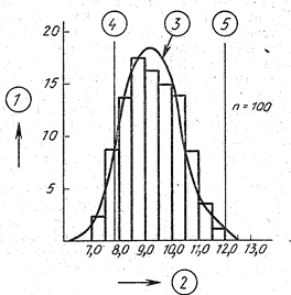 /—частота; 2— толщина пластины, мм; 3— кривая распределения частоты; 4— нижнее предельное значение нормы; 5— верхнее предельное значение нормы (верхняя граница нормы)