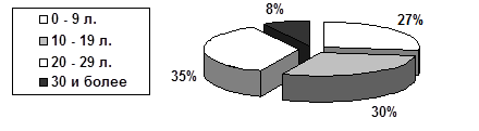 1. Время работы в данной организации. Большинство работников исследуемой организации работают в ней довольно продолжительное время. В сумме от 10 до 30 и более лет в данной организации работает 73% опрошенных. Менее 5 лет работают лишь 7 человек, то есть 19%.