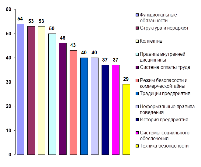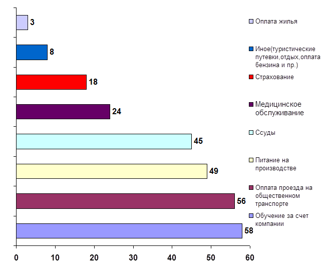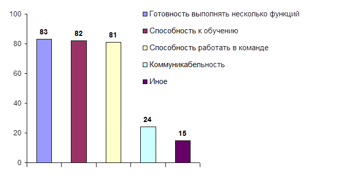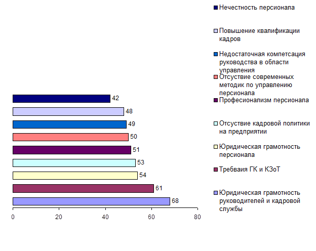 Самая высокая степень потребности в инновациях наблюдается в области трудового законодательства и юридической грамотности как руководителей и кадровых служб, так и сотрудников (61, 68 и 54 упоминаний соответственно). Далее респонденты ощущают потребность в изменениях в кадровой политике и повышении общего уровня подготовки (профессионализма) персонала (53 и 51 упоминаний соответственно). Затем требуется повысить недостаточную компетенцию руководства в области управления, внедрить современные методики управления персоналом (49 и 50 упоминаний соответственно). Замыкают первую группу потребность в новых механизмах повышения квалификации кадров и воспитание «честного» персонала (48 и 42 упоминаний соответственно).