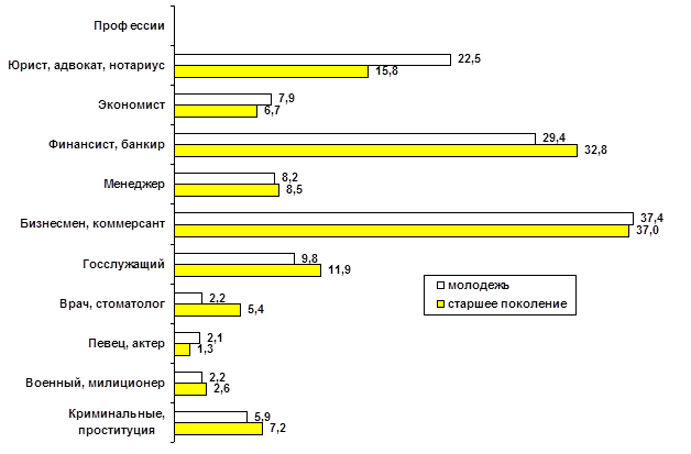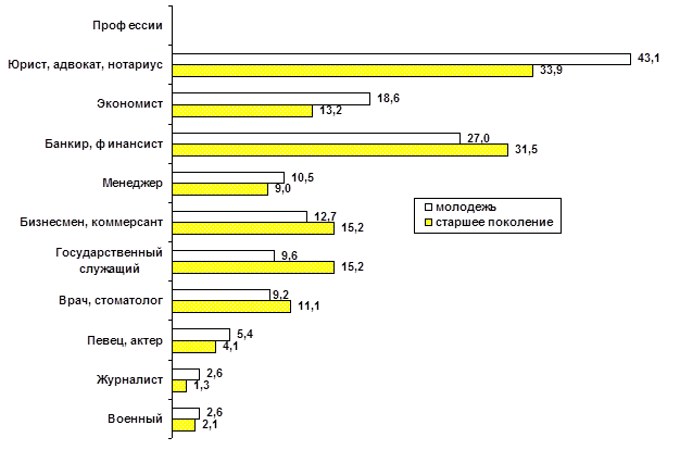 Наибольшим спросом у молодежи в 2002 году пользуются такие профессии, как экономист и бухгалтер (23%), менеджер (19%), юрист (13%), творческий работник (12%), программист (11%), предприниматель (10%). Ситуация в этом направлении не сильно изменилась по сравнению с летом 1998 году (см. приложение №1).
