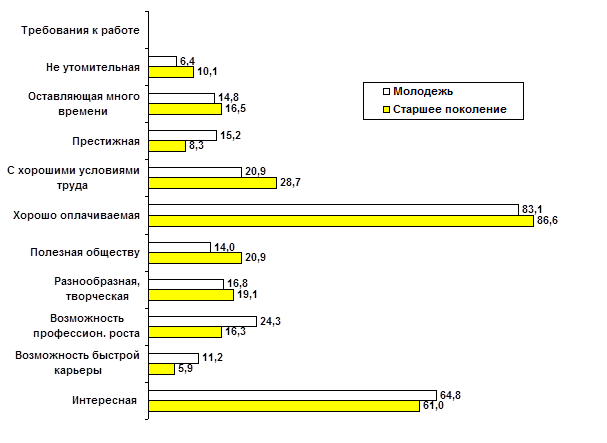Еще одной серьезной проблемой является падение престижа производительного труда для значительной части молодых людей. Вследствие этого для молодежи стал характерен социальный пессимизм, они не верят в возможность иметь интересную, содержательную работу, оплачиваемую в соответствии с мерой своего труда на уровне мировых стандартов. Происходят полярные изменения трудовой мотивации. Квалифицированные молодые кадры часто меняют специальность, что в дальнейшем может привести к дисбалансу в профессиональной структуре рабочей силы. Приоритет отдается не содержательному труду на производстве, а труду с низкой интенсивностью, направленному на получение значительной материальной выгоды любым путем. Все это, конечно, не может способствовать подъему экономики страны.