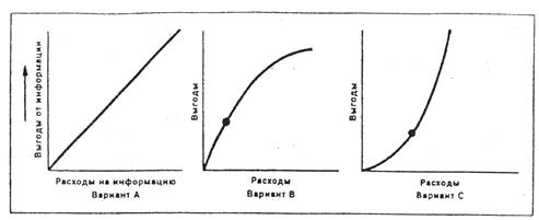На рис.4. проиллюстрированы три варианта обстоятельств, с которыми может столкнуться руководитель, оценивая затраты и выгоду от дополнительной информации. По варианту «А» выгода от каждой дополнительной единицы информации равна затратам на ее получение. (Это напоминает концепцию предельного дохода и предельных издержек в экономических науках.) В той мере, в какой руководство готово платить за получение дополнительной информации, оно будет иметь дополнительную выгоду. Однако ограничения временные и интеллектуальных возможностей менеджера в плане усвоения и использования все большего количества информации должны, в конечном счете, сделать покупку дополнительной информации экономически нецелесообразной.